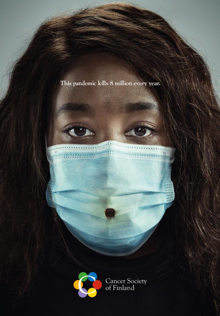 მოწევა ყოველწლიურად რვა მილიონ ადამიანს კლავს და ეს მაჩვენებელი დღითიდღე იზრდება. ამ მონაცემებით, მტკიცდება, რომ მოწევა არის პანდემია, რომლის შესახებაც ცოტა საუბრობს, თუმცა შედეგები ფატალურია. სწორედ ამიტომ ფინეთის კიბოსთან ბრძოლის ასოციაციამ სოციალური კამპანია დაიწყო და ონლაინმედიაში ფოტოები გაავრცელა, სადაც მწეველებს ნიღბები უკეთიათ. ფოტოებზე მინაწერებია: მოწევისთვის თავის დანებება ისეთი მნიშვნელოვანია, როგორიც არასდროს.